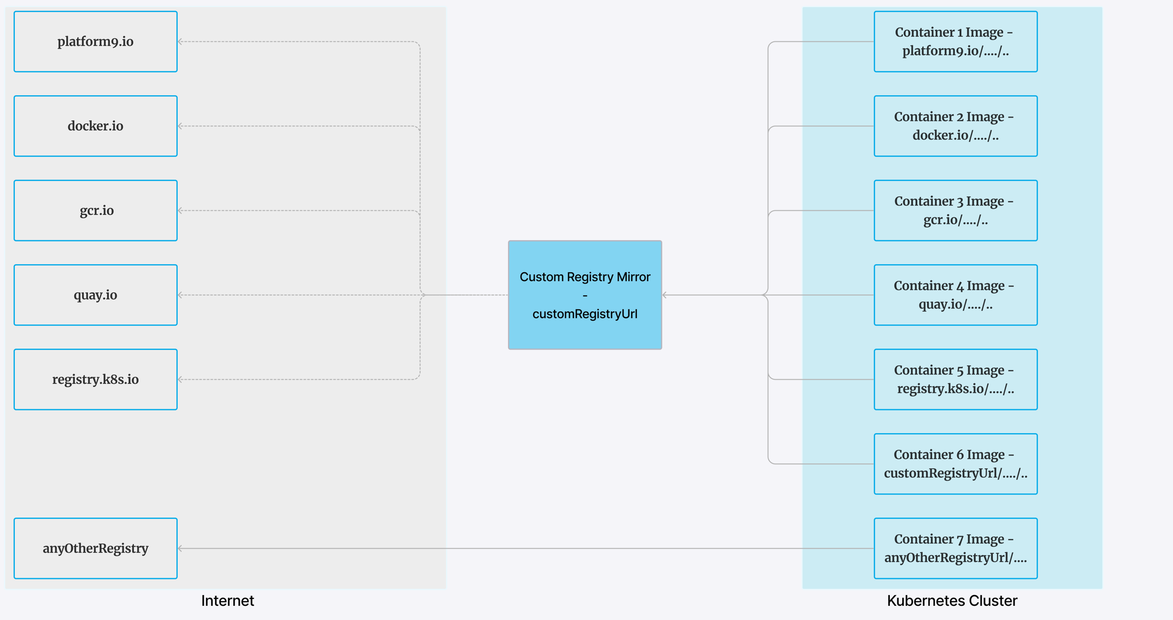 PMK support only the following repositories with this feature. Images with any other registry URL will be directly downloaded from the mentioned registry (See in figure - anyOtherRegistry).