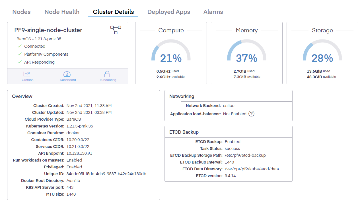 On the Infrastructure > Clusters > Cluster Detail page, we are provided with a significant amount of information. It shows the name of the cluster, the type of cluster, connection status, whether the Platform9 components are healthy, and if the API server is responding for all nodes. Additionally, it provides links to Grafana, the kubernetes dashboard and the kubeconfig download config. A graphical overview of the attached nodes also displays the compute and memory resources available, along with the storage space available on all the nodes.