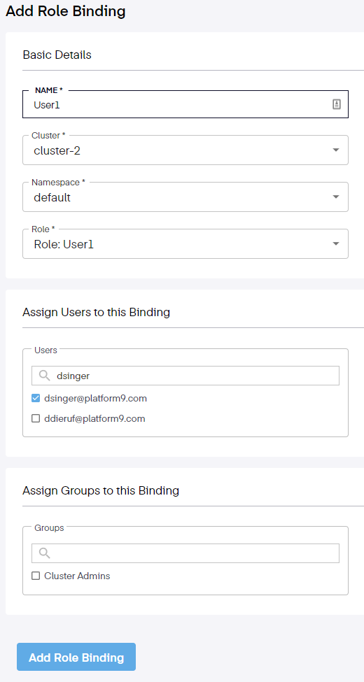 A RoleBinding assigns an existing group of users or users to a Role within a namespace for a cluster. Follow the steps given below to create a Role, through the Platform9 Clarity UI.