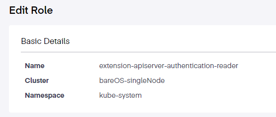 Next, a new window will open showing the fields available to edit. In this view, we see the basic details of the role including the name, the cluster it is attached to, and the namespace it occupies.