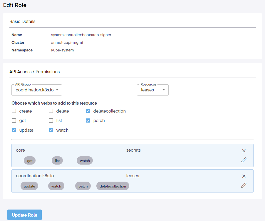 Once the new verbs have been selected, click Update Role to complete the modification. Under that section, we can now see the new core verbs associated with the role. Clicking on the pencil icon highlights the associated verbs for this resource. Clicking on the X removed the section.