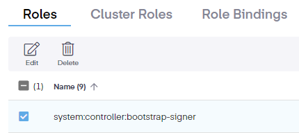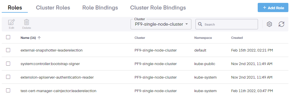 In order to edit an RBAC role, go to the RBAC > Roles > page. The Roles page shows the name, assigned cluster, namespace of a role, and the date it was created. It also allows for the addition, editing, and deletion of roles.