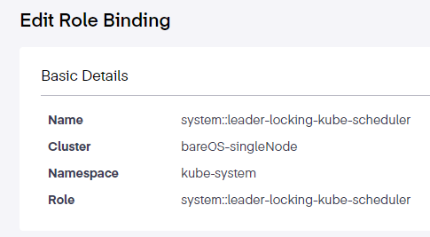 Once the new page opens, we see some basic information about the RoleBinding. This includes the name of the role, the cluster where is resides, the namespace it occupies, and the name of the role binding.
