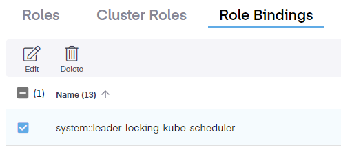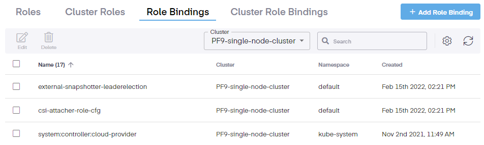 The RoleBinding edit page shows the name, assigned cluster, and namespace of a role. It also allows for the addition, editing, and deletion of roles. To edit an RBAC RoleBinding, go to RBAC > Role Binding and then choose one by selecting it via the checkbox and then click on the Edit icon.