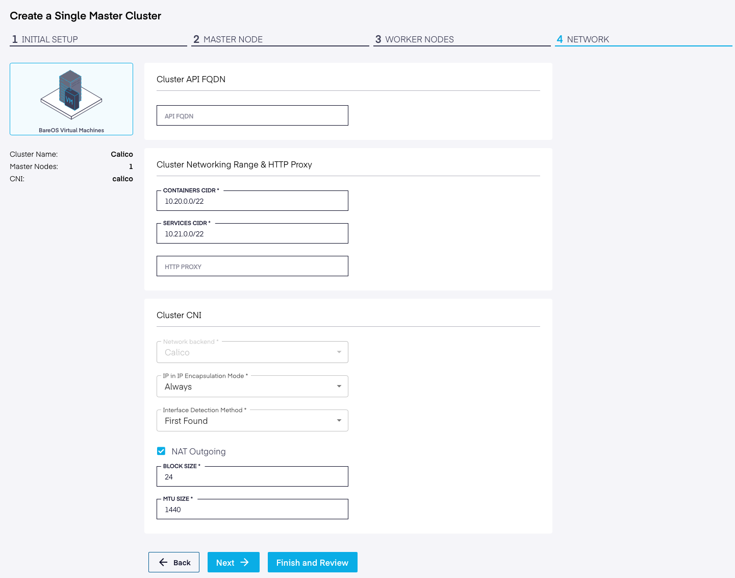 Calico supports multiple networking configuration options. You will see these options in the PMK Cluster creation wizard when you choose Calico as your preferred CNI for the cluster.