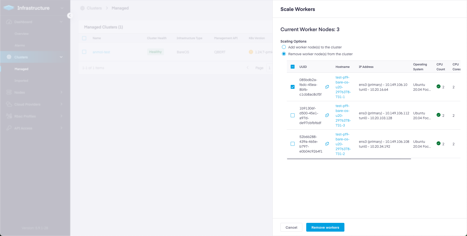 * Click Remove to detach the nodes. This step detaches the nodes from the cluster and the nodes will no longer be part of the Kubernetes cluster. If the removed node is a master node, it is detached as an etcd member with this step.