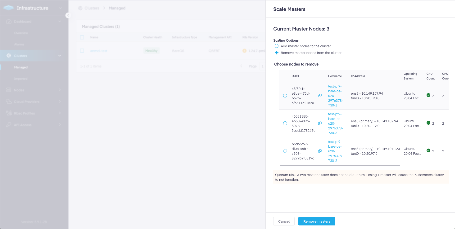 Click Remove to detach the nodes. This step detaches the nodes from the cluster and the nodes will no longer be part of the Kubernetes cluster. If the removed node is a master node, it is detached as an etcd member with this step.