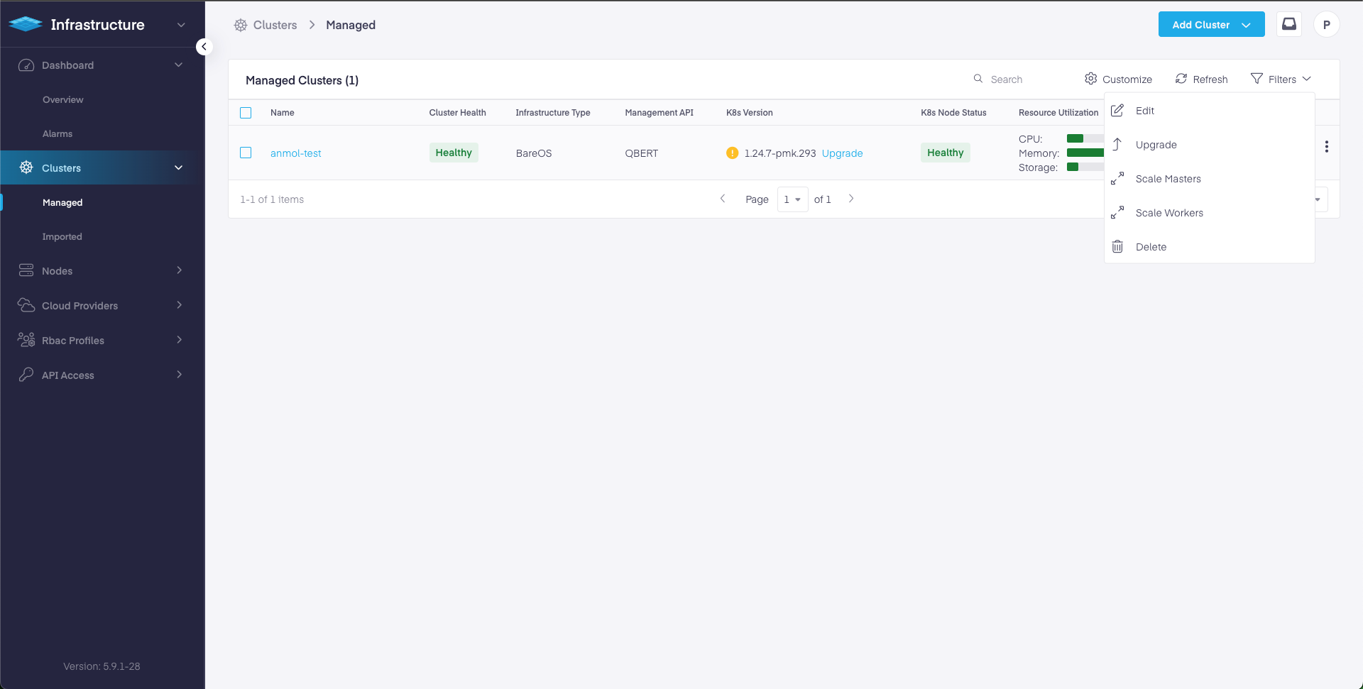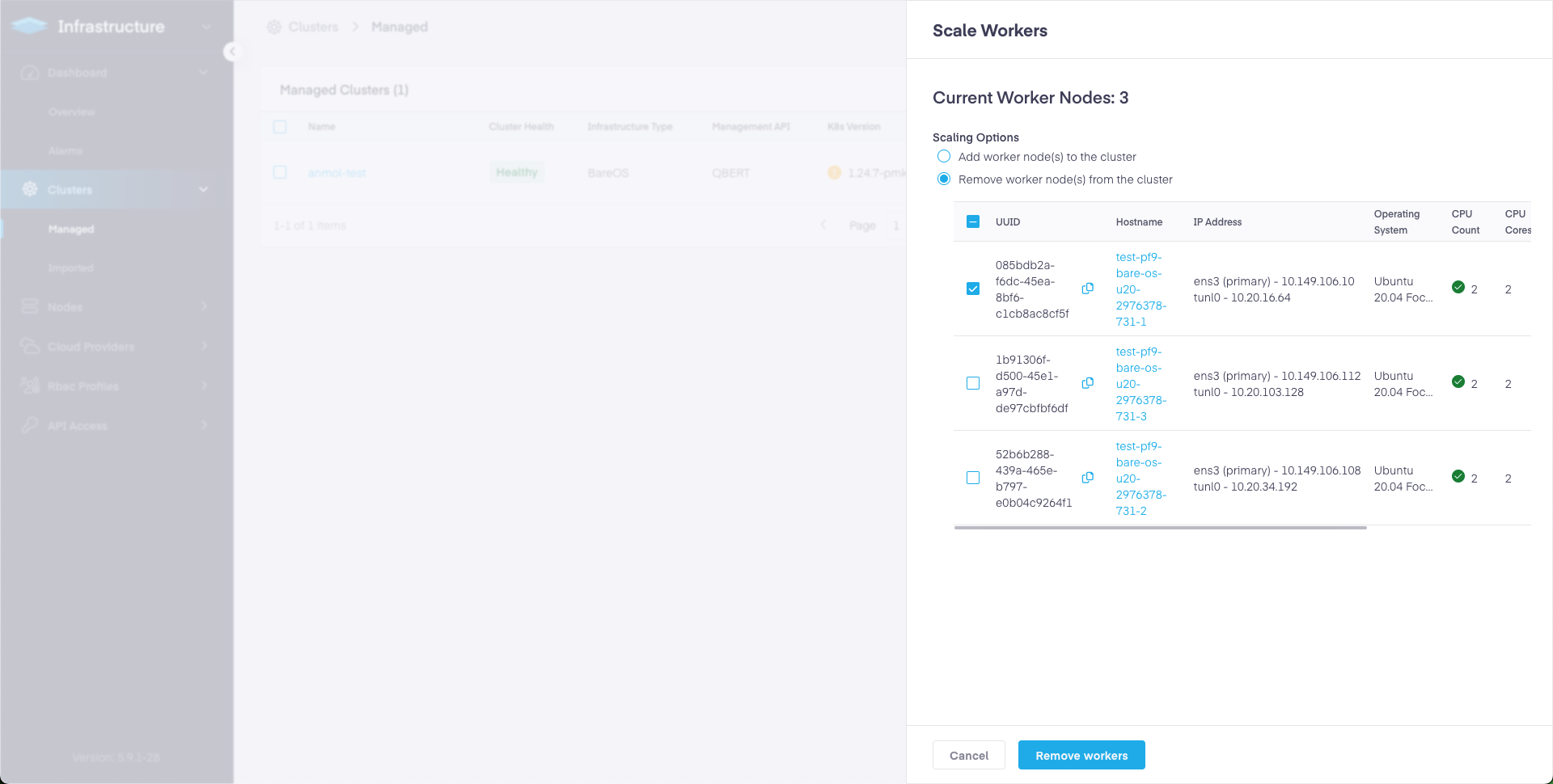 Nodes that are attached to on-premise (BareOS) Kubernetes cluster created using PMK can be detached when the nodes are not required to be a part of the cluster.