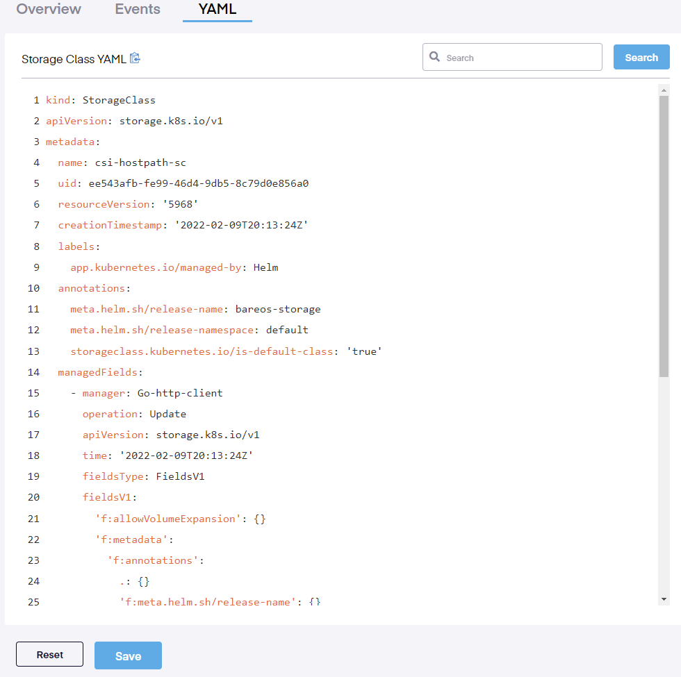 To access the Storage Class Details page, go to Storage > Storage Classes tab > and click on the Storage Class link. This opens a page providing an overview, a list of events, and the associated YAML file detailing the specific parameters of the storage class.