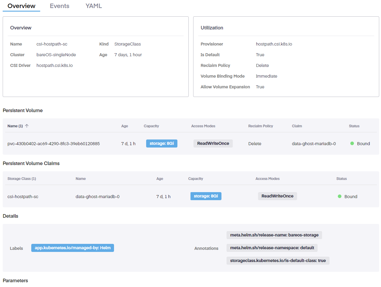 On this page, we see three tabs; the Overview, Events, and YAML pages. On the Overview page, we see a summary of the storage class including its name, kind, cluster is it attached to, its age, and the associated CSI driver for that storage class. Further to the right, utilization details are shown, including the provisioner. If this is the default storage class, the reclaim policy (which can be either Delete or Retain, but the default is Delete), the volume binding mode, and what the Allow Volume Expansion option is.