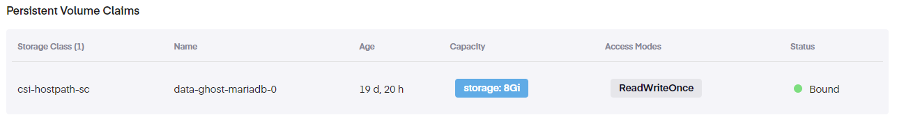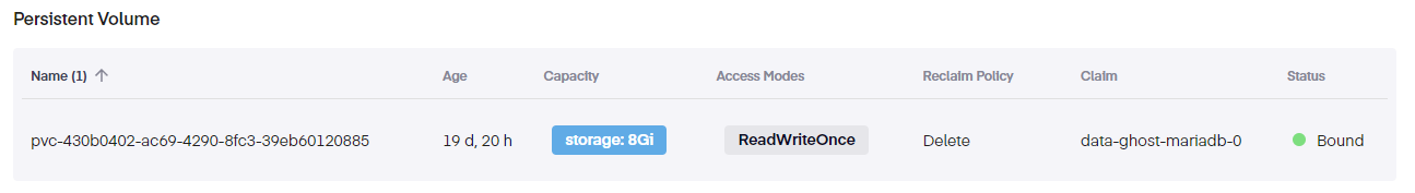 Further down, we observe the following details for any attached Persistent Volumes.