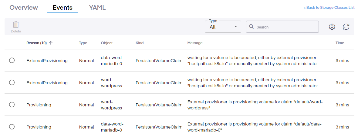 Clicking on the Events tab shows incidents and actions allows users to view any events, should they exist. The dropdown sorts events into three Warning, Error, and Normal. Searching is also available to locate a specific event type.