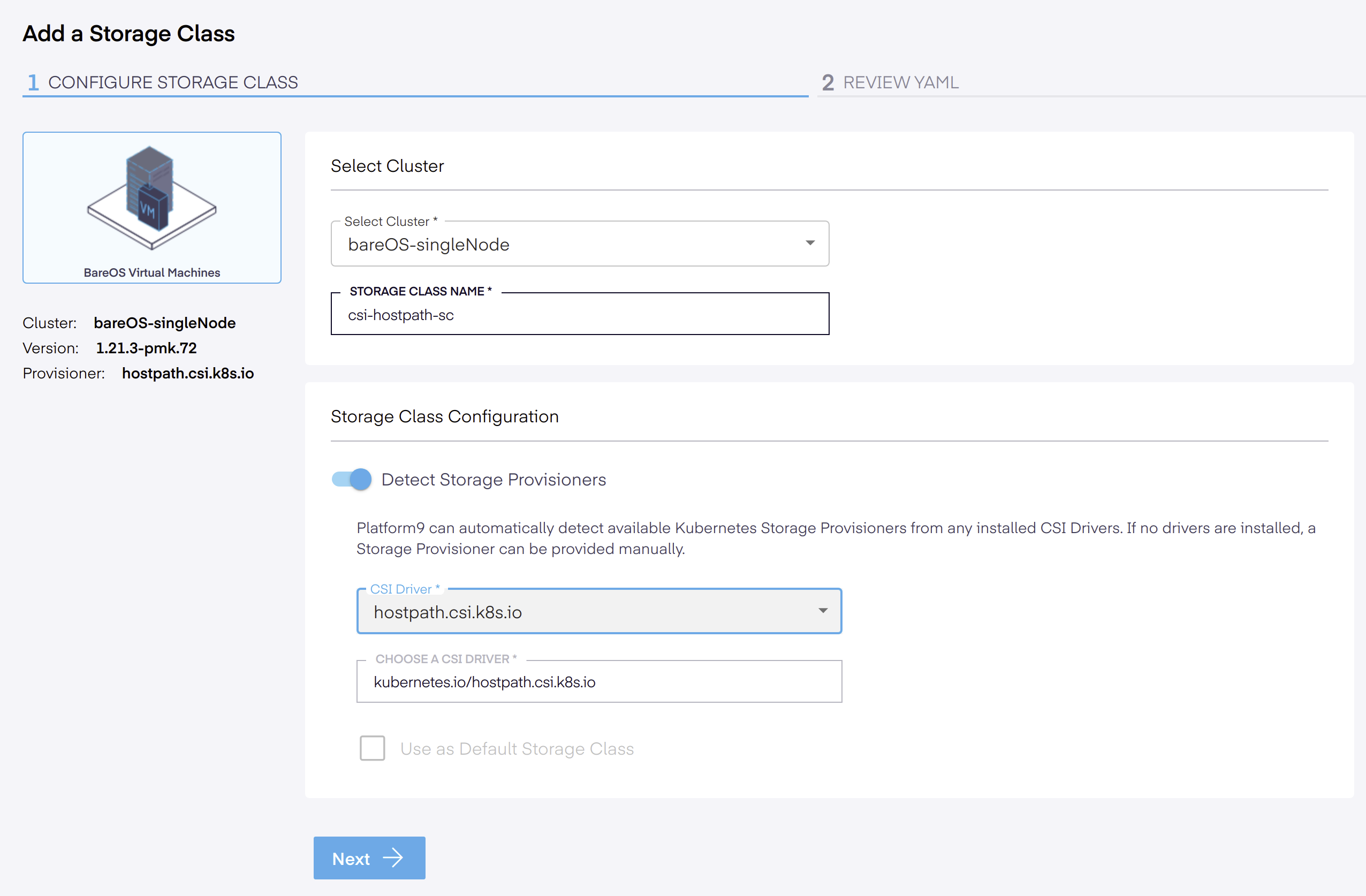 Platform9 can automatically detect available Kubernetes Storage Provisioners from any installed CSI Drivers. If no CSI driver is installed, a Storage Provisioner can be provided manually.