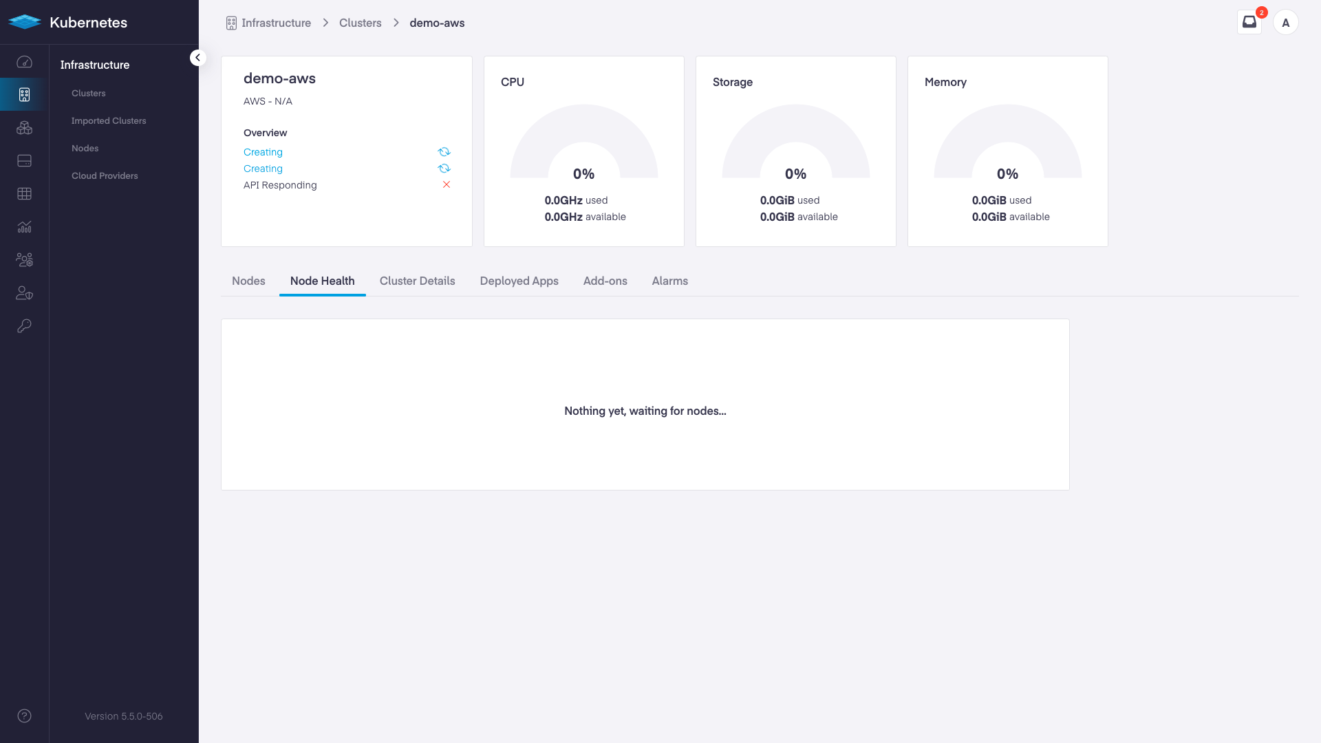 After creation successfully initializes, you will be directed to the "Node Health" tab where you can watch the progress.