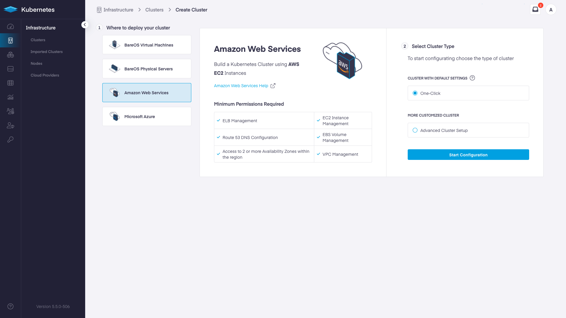 From your dashboard, click the "Add Cluster" button and choose "Amazon Web Services" as your infrastructure provider. Choose the "One-Click Cluster" button to get started.