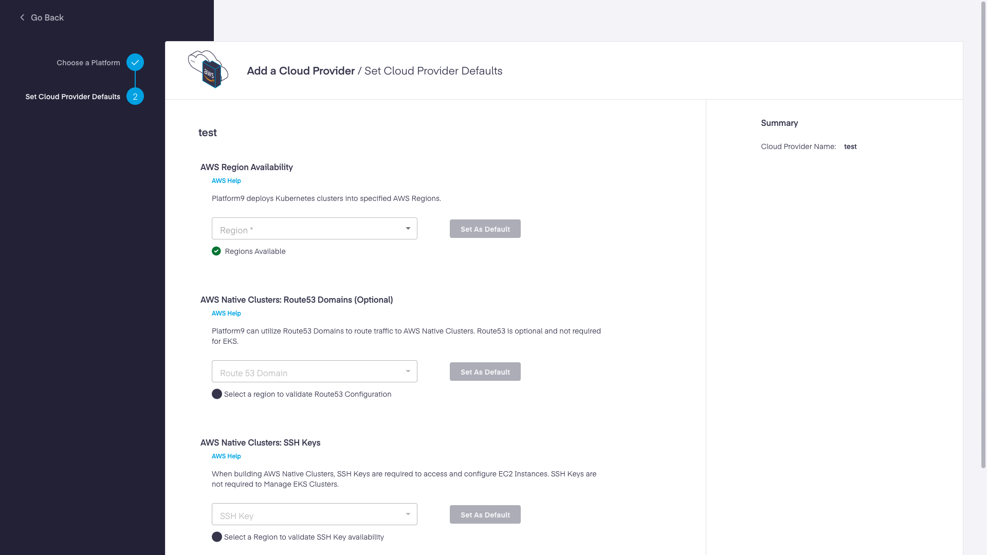 <figure><img src="https://content.gitbook.com/content/dN3UKqOJY9TdzQV1eEIf/blobs/GFELTry8uh6v1J4VrIby/sk90bpd6cmutgw7jibe9kkfzb7sdcbyoi9bkk2woobr4iz4uudtl2pnele1e1jsh.png" alt="Platform9 – UI - Add New AWS Cloud Provider"><figcaption><p>Platform9 – UI - Add New AWS Cloud Provider</p></figcaption></figure>