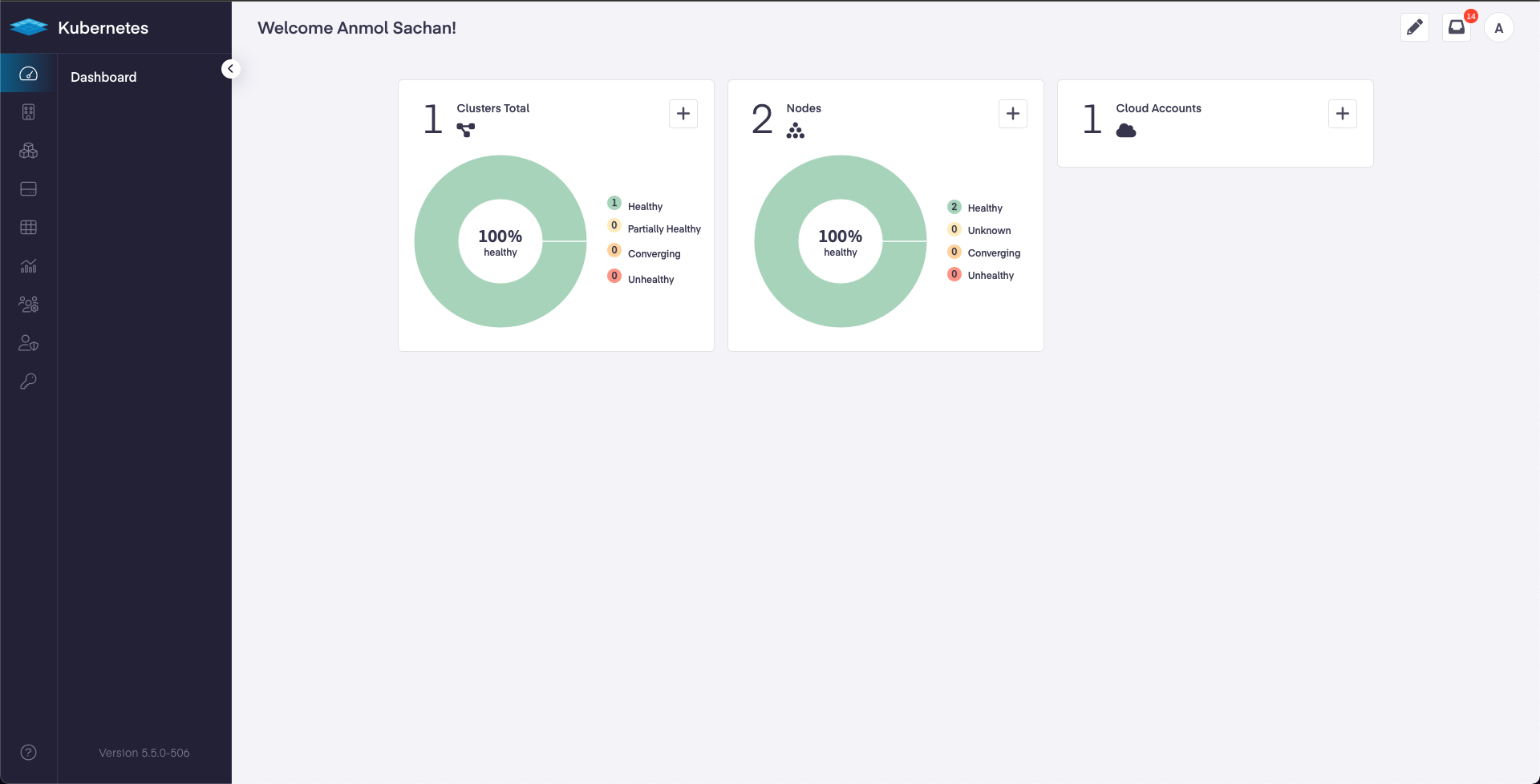 Log in to your Platform9 account. Once you sign in you’ll be directed to your account's dashboard. This is a summary of all Kubernetes clusters, nodes, pods, and cloud accounts associated with your Platform9 account. If this is a brand new account, there may not be anything associated… yet!