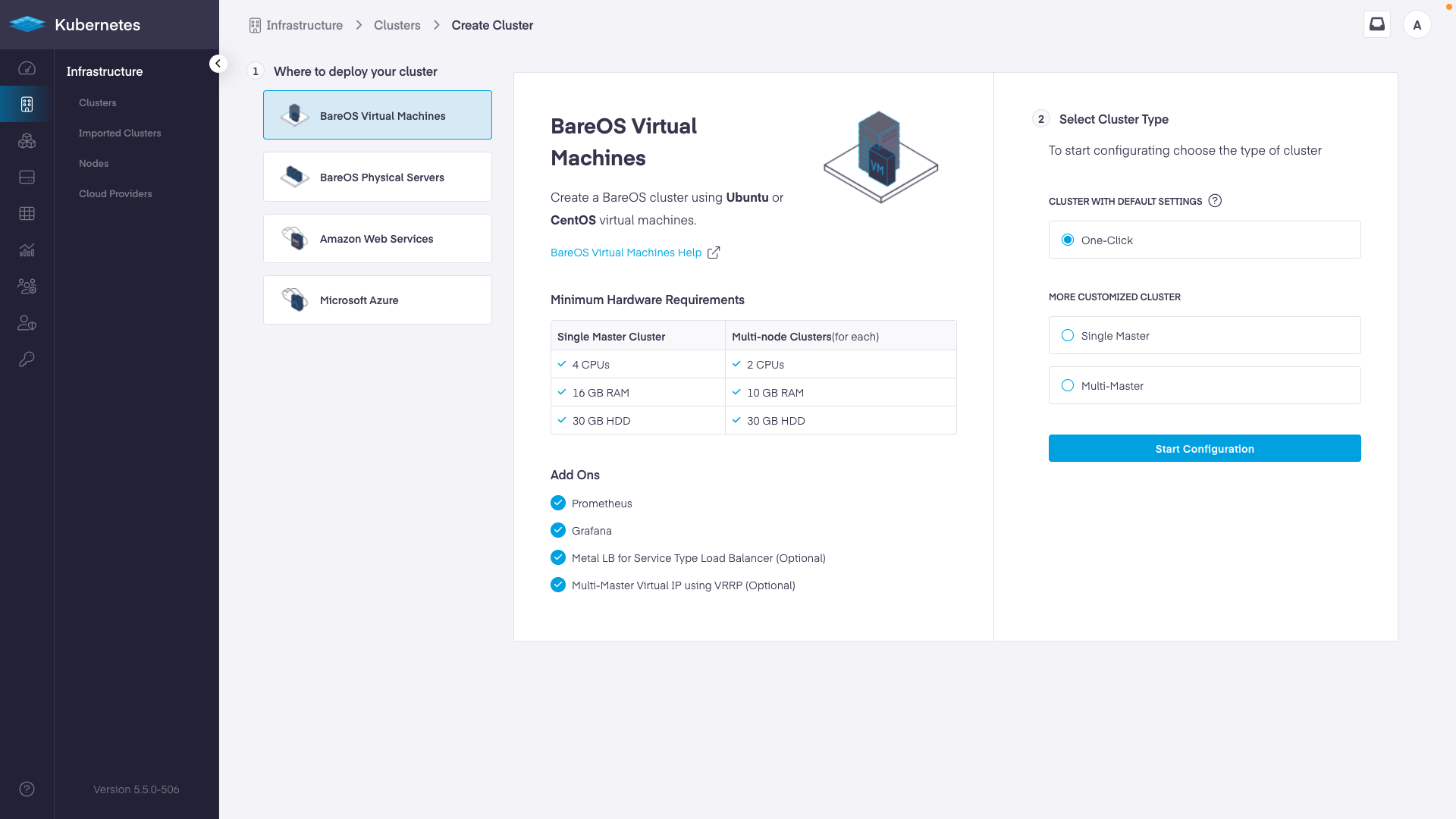 From your dashboard click the "Add Cluster" button and choose "BareOS Virtual Machine" or "BareOS Physical Server" depending on your set up. Then choose the "One-Click Cluster" button to get started.