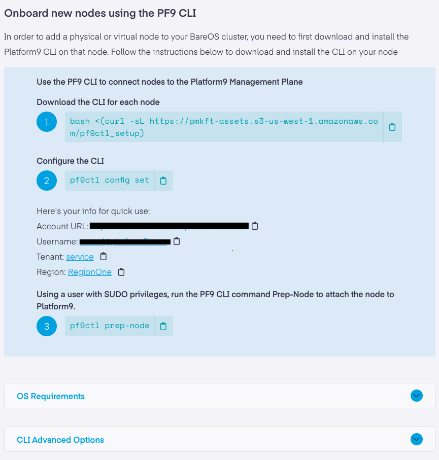 From the dashboard click the "Add Node" button, then choose the "PF9 Cli" tab. This area will give you direction about how to download and install our CLI on your Virtual Machine or physical server and then configure the CLI to talk back to your PMK Account. Note when running the `pf9ctl config set` command you will be prompted to provide your account credentials established earlier.