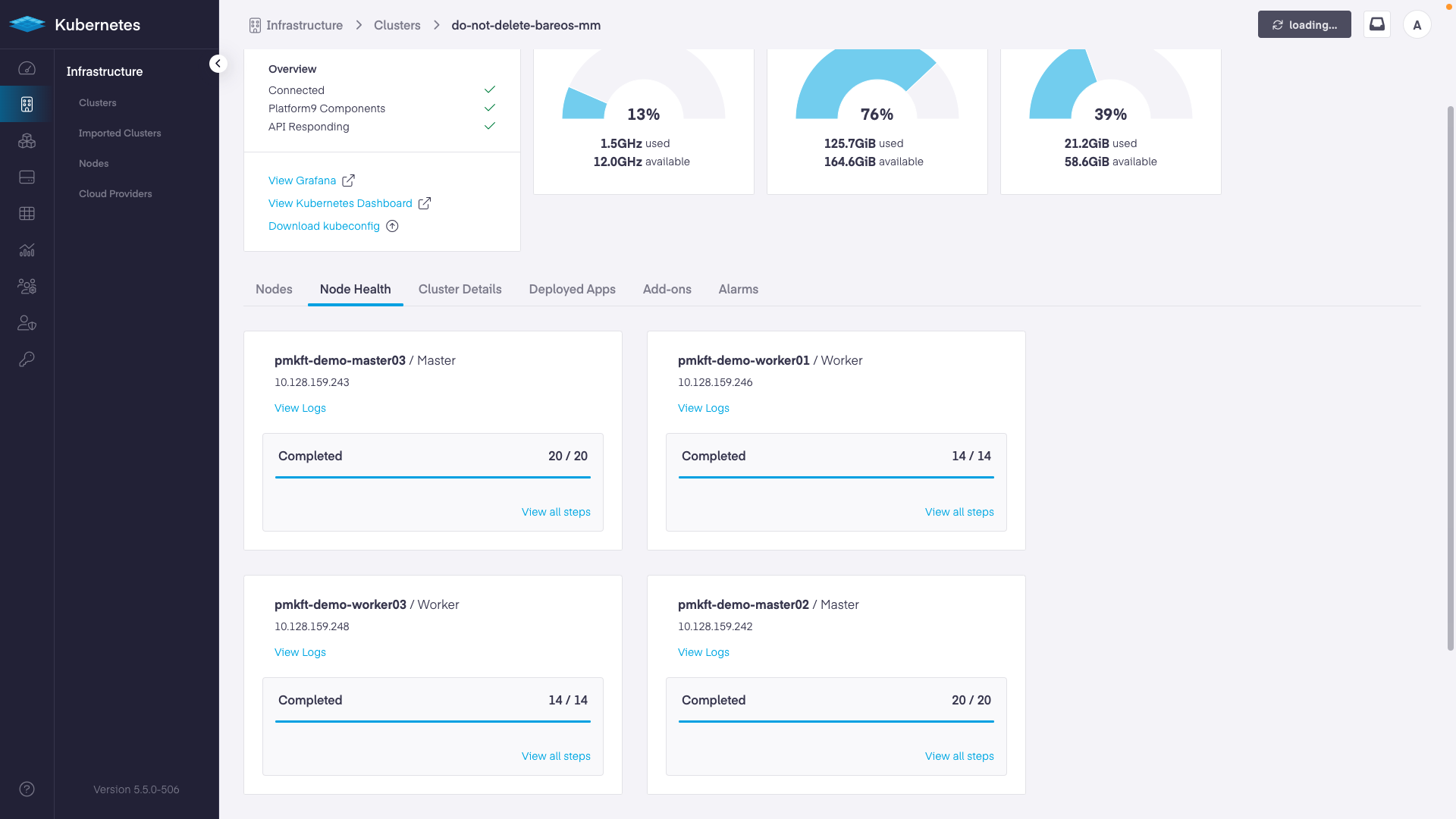The Platform9 system will promote the node to be a Kubernetes master node and enable your workloads to run on it. Routing will be automatically configured as well as full observability.