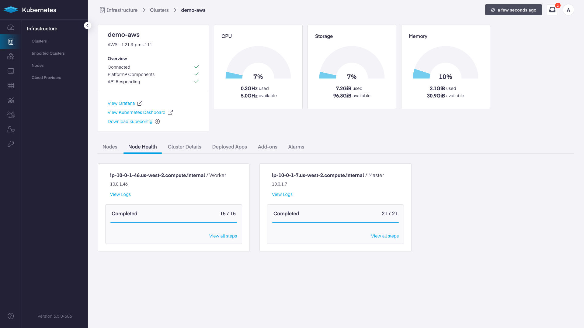 To follow the progress of your cluster creation go back to the Platform9 dashboard and navigate to “Infrastructure”, and then “Node Health”. Initially, the screen will be: