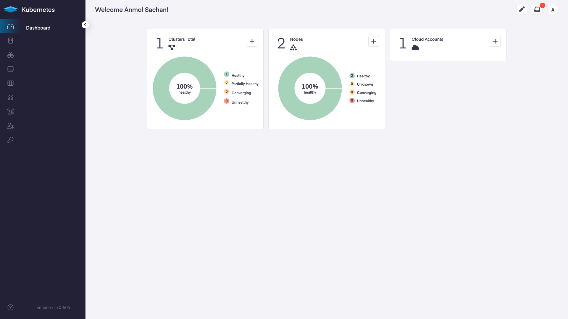 Log in to your Platform9 account. Once you sign in you’ll be directed to your account's dashboard. This is a summary of all Kubernetes clusters, nodes, pods, and cloud accounts associated with your Platform9 account. If this is a brand new account, there may not be anything associated… yet!
