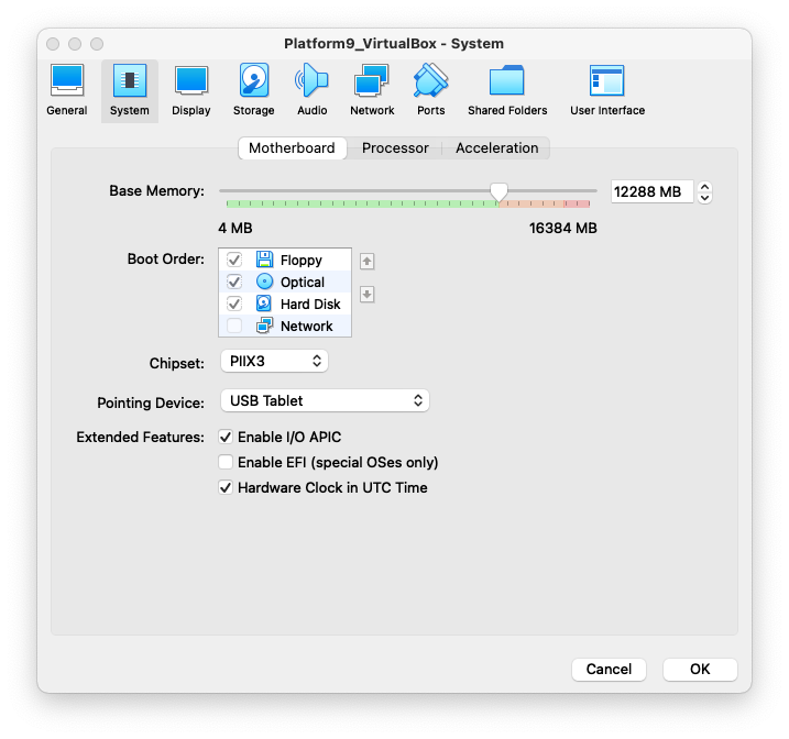 The OVA may be configured with an insufficient amount of Base Memory for the PF9 installation. Re-allocate the Base Memory to at least 12 GiB (12288 MB) in order for the PF9 installation to succeed.