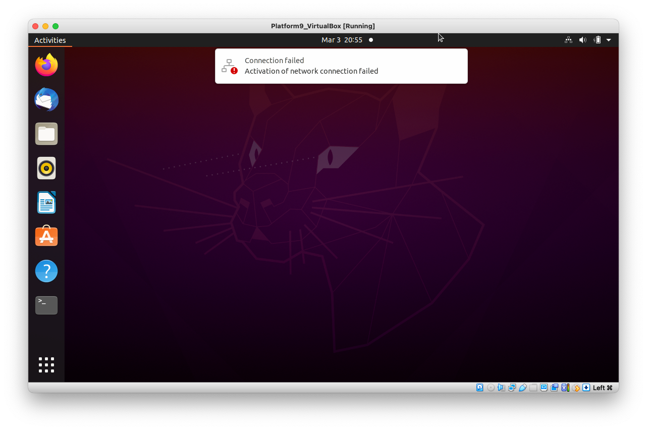 If you get a notification that the "Activation of network connection failed" within the OVA, change the VirtualBox network settings to be attached to "NAT" instead of "Bridged Adapter" mode.