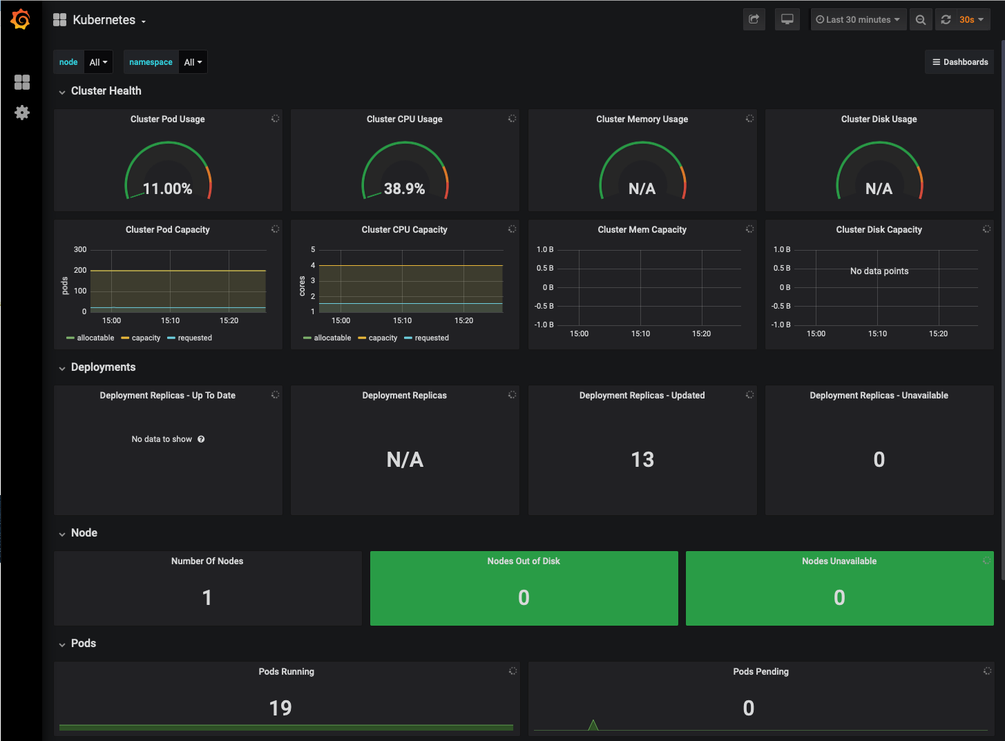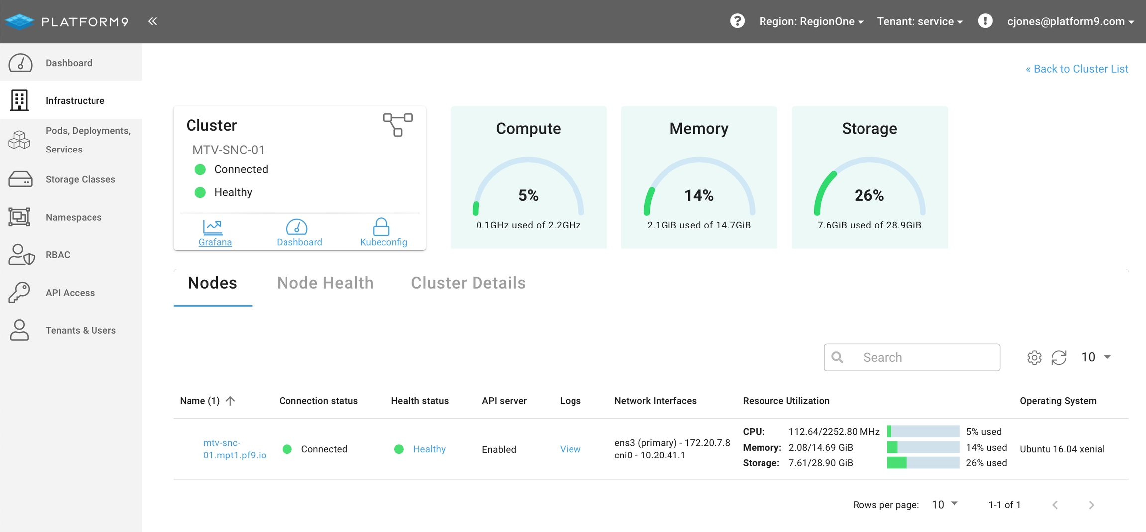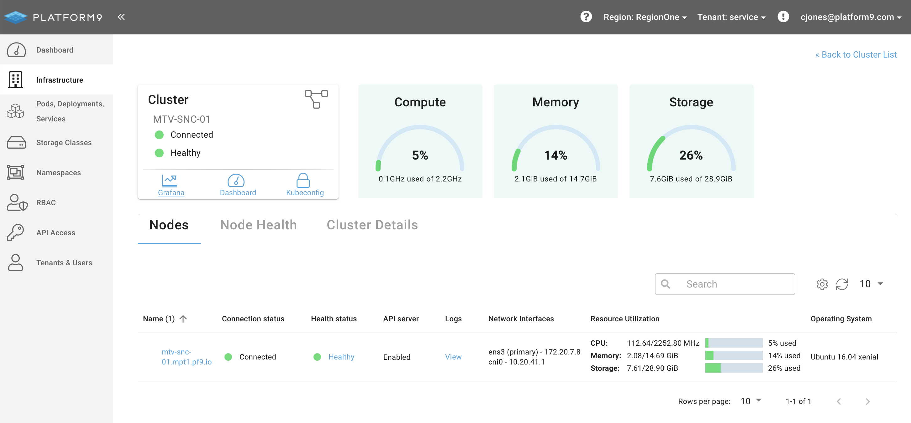 Once launched Platform9 will proxy a secure connection to the Monitoring deployment and load the Grafana dashboard for the selected cluster.