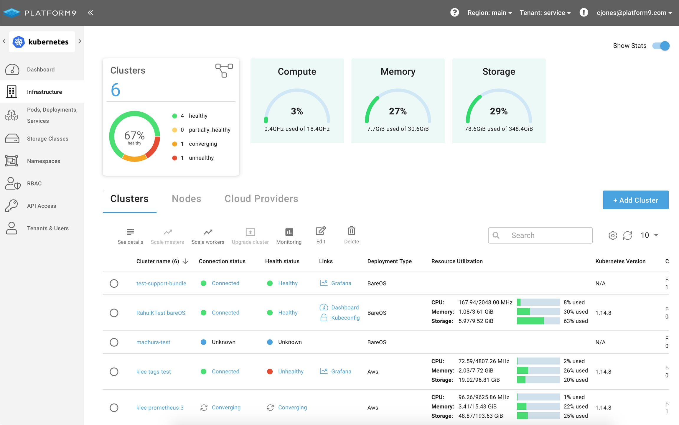 There are two ways to launch the Grafana dashboard for an individual cluster, either from the main Clusters view on the Infrastructure page or from the Cluster’s Details page.