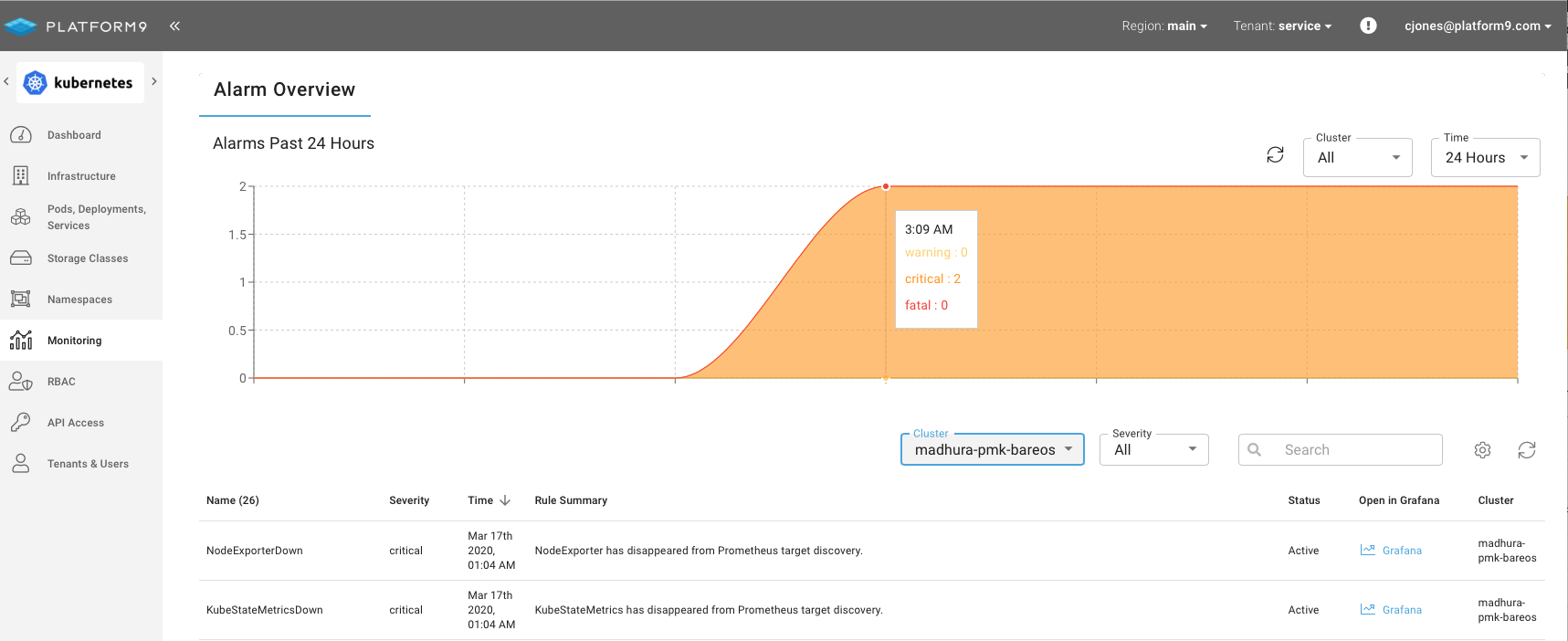 The PMK Monitoring dashboard is a real-time multi cluster view into alarms for the last 24 hours. Using this dashboard you are able to filter alarms by severity, cluster and time. Each alarm contains a link to drill down to Grafana for further investigation.