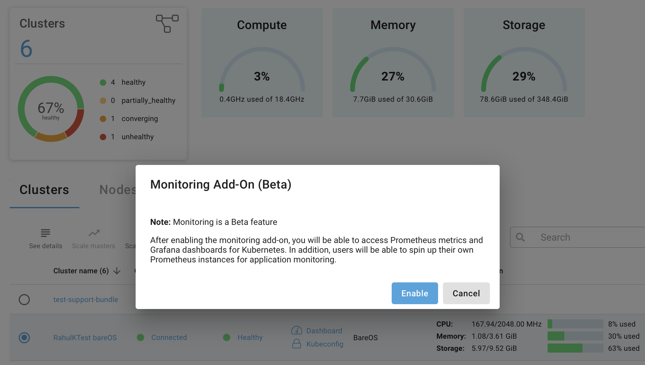 To ensure monitoring is enabled navigate to Infrastructure click the Clusters tab and then select a cluster, this will activate the table toolbar, then click the Monitoring button. In the popup click Enable.