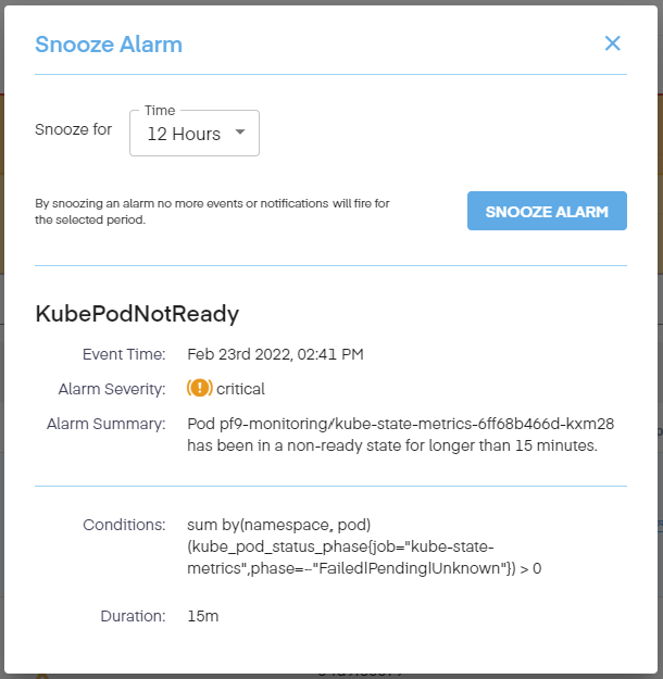 To silence an alarm, select the radio box next to the specific alarm, and click on the Snooze icon located below the Alarm Graph. This brings up a small screen which allows the user to select a timeframe to snooze the alarm for. This can be set for: