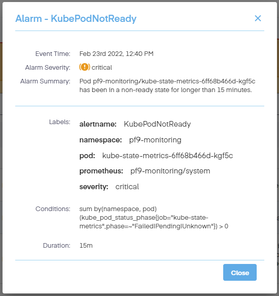 This also defines the name of the alert type, the time of the event, its severity, a summary of the alarm, the conditions of the alarm, and the duration.
