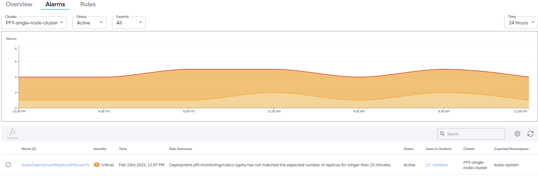 To view any existing monitoring alarms, go to the Monitoring > Alarms. Next, select the cluster, status, and severity to see any available alarm related information. Initially, we see the name of the cluster, the type of cluster, connection status of the nodes in the cluster, whether the Platform9 components are healthy, and if the API server is responding for all nodes. Additionally, it provides links to Grafana, the kubernetes dashboard and the kubeconfig download config. Below this, a graphical overview of the alarms is seen, which provides a bird's-eye view of events. Clicking on the dropdown tabs shows the status of the alarm (All, Active, Suppressed, or Closed), the severity (Warning, Critical, or Fatal), and the overall timeframe of the alarms.