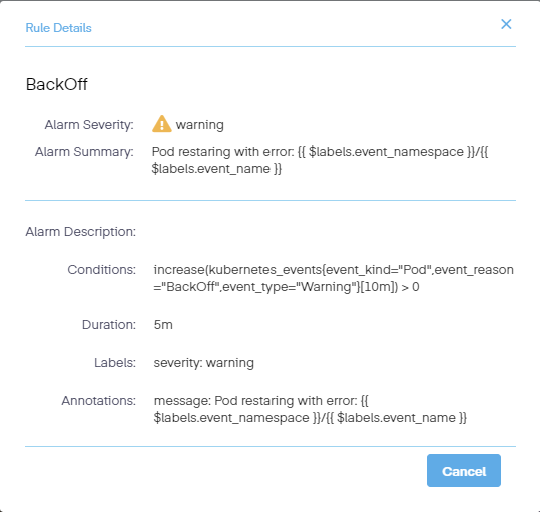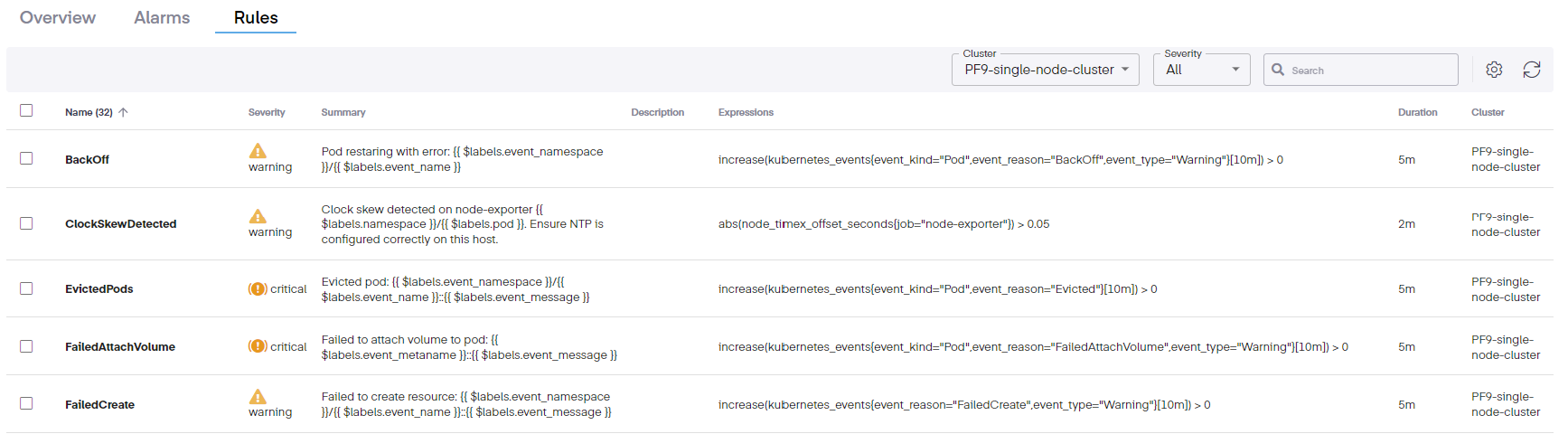 On the Monitoring > Rules page, we see a list of alerts that have been triggered and documented from a defined ruleset for a managed asset. It not only provides an overview, but also more in depth details. Options include selecting the name of the cluster, the severity level, and a search box to locate specific events or alerts.