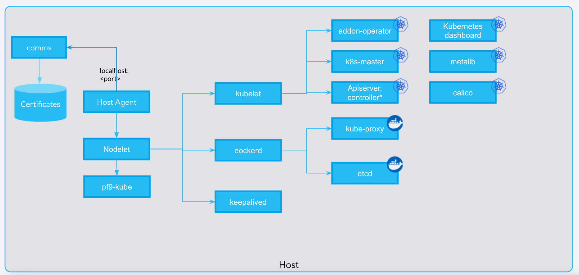 This article describes several of the service elements that constitute a notable portion of the Platform9 components. In addition to the pf9-hostagent, pf9-comms, and pf9-nodelet services, Platform9 also installs other services that comprise a Kubernetes Cluster. The Host Internals page describes these elements in additional detail.