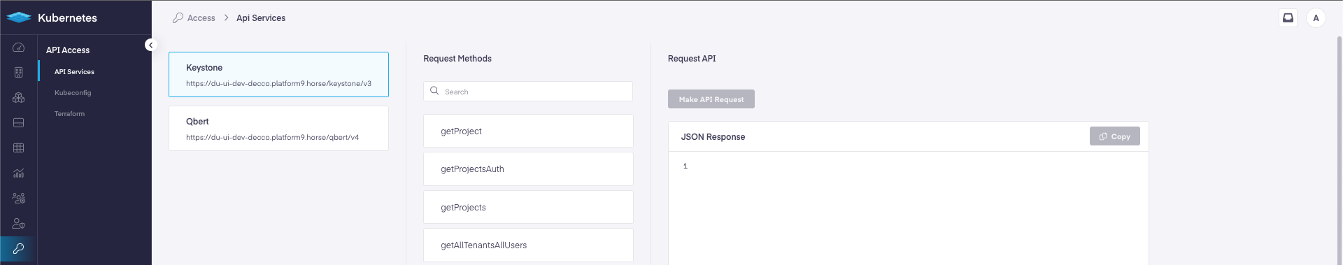 You can locate the URL for the Qbert API endpoint specific to your instance by navigating to API Access → API Services in the UI.