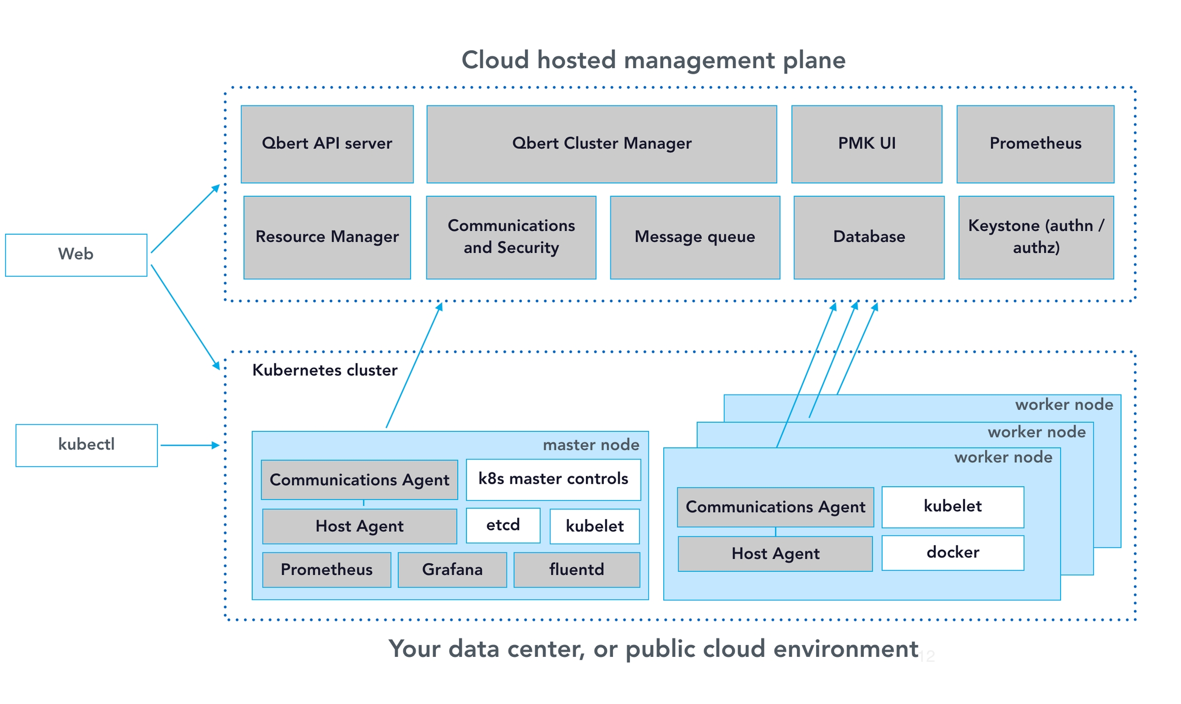 Qbert is the PMK cluster manager – residing on the SaaS management plane – which exposes CRUD (Create, Read, Update, Delete) operations on one or more Kubernetes clusters via a central REST API endpoint, primarily used by the web UI to communicate with the management plane.