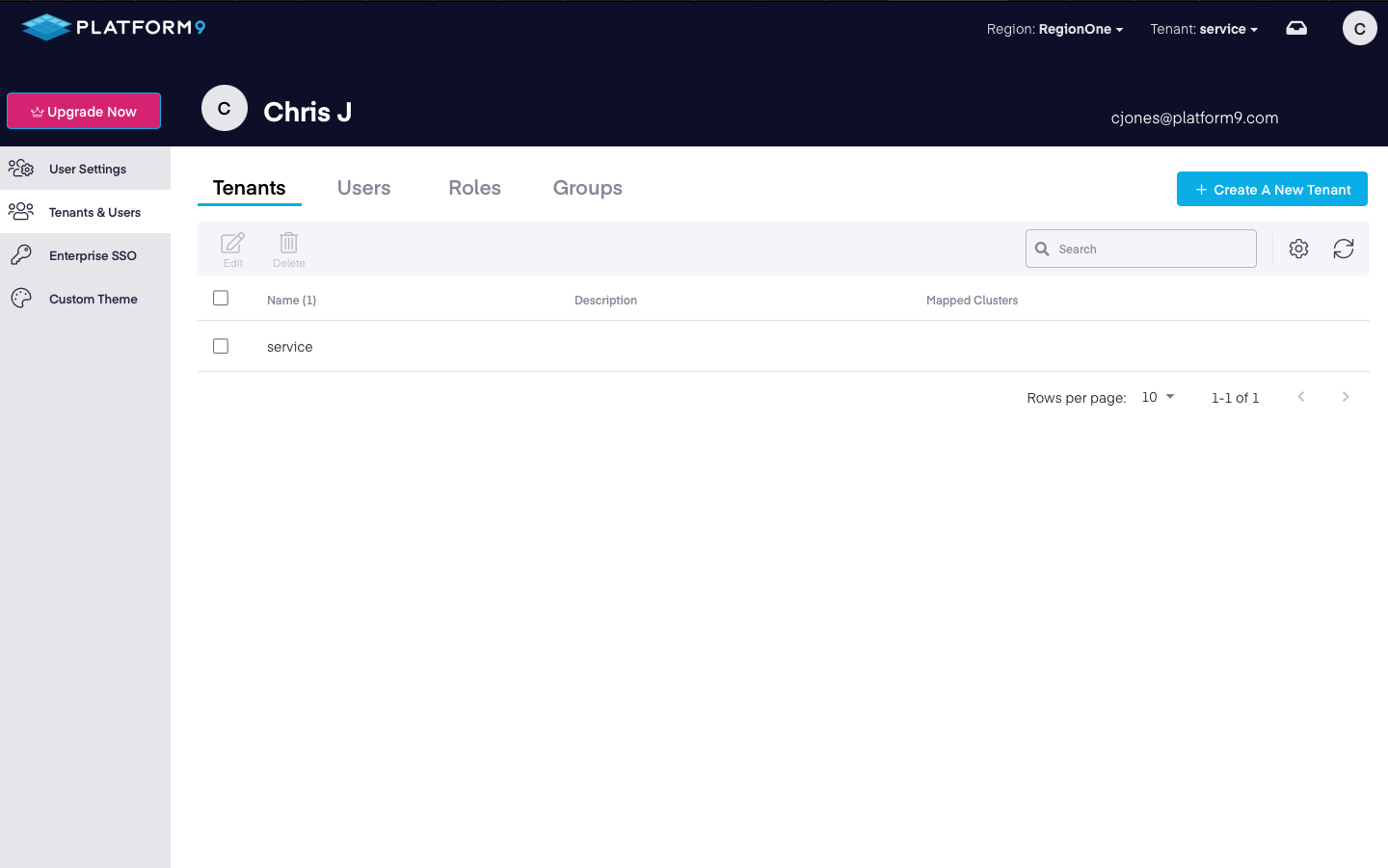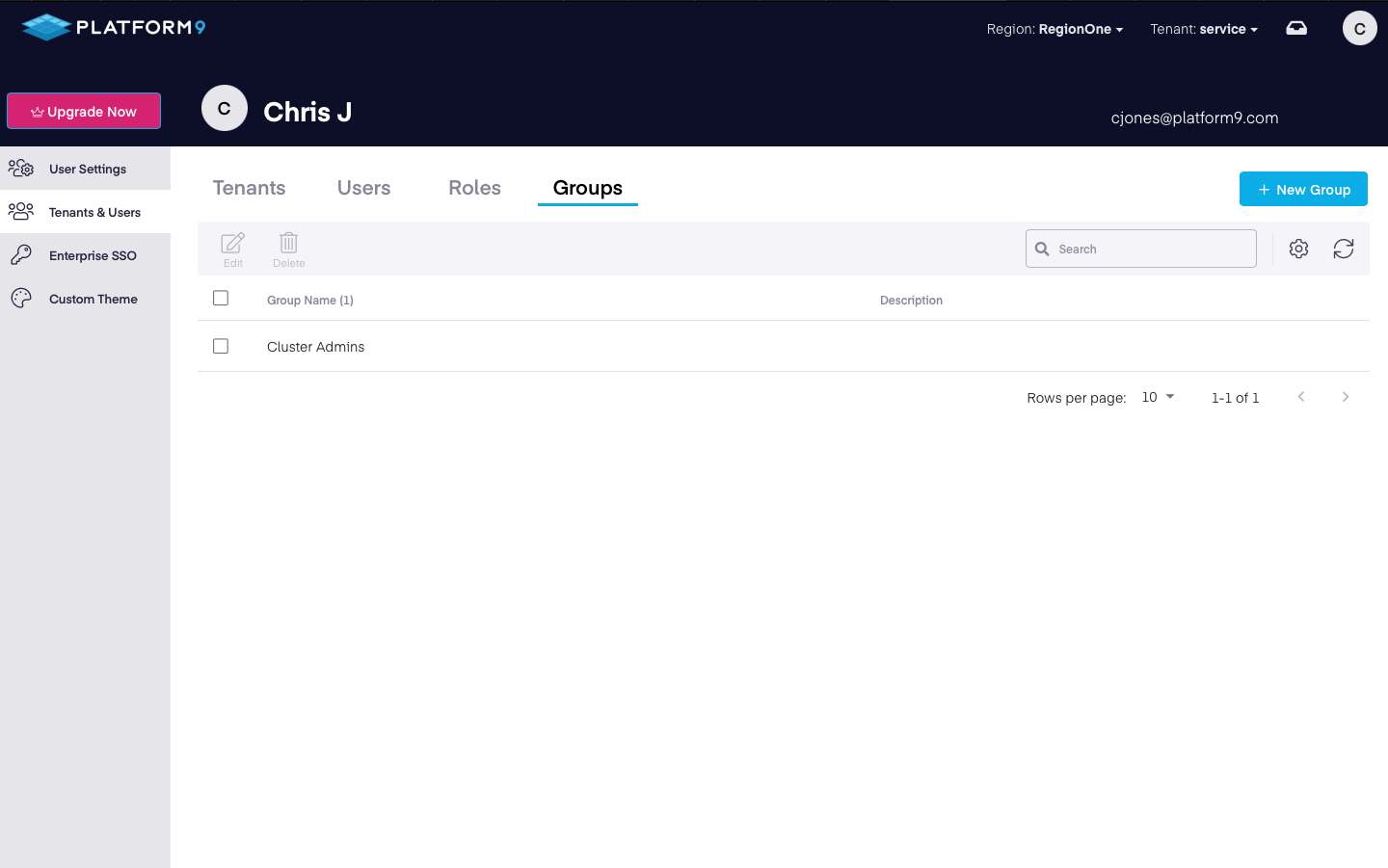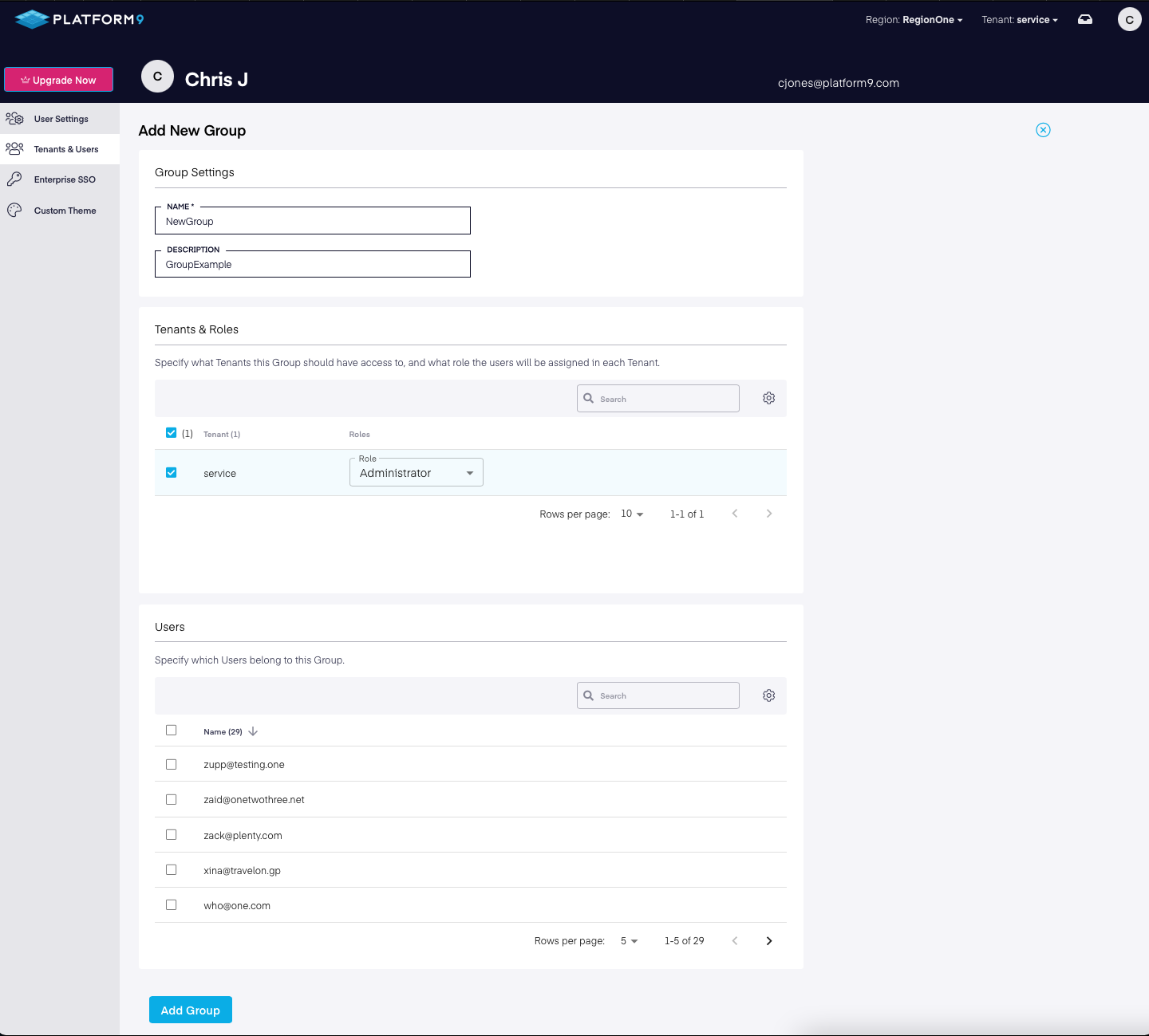 On the Add New Group page, enter a Name, Description, Tenant and Role access. Next, define what Tenants this Group will be able to access, and what role those users will be assigned to within each Tenant. Once complete, click Save. The users in that group can now access the Platform9 services and control cluster access as noted in the Kubernetes RBAC Policies.