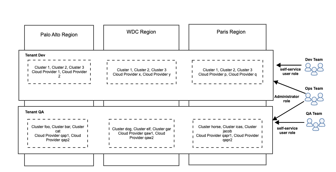 The diagram below depicts the tenancy model and the relationship between regions, tenants, your Kubernetes clusters and platform users.
