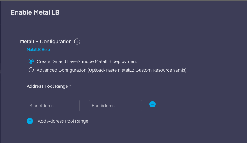 * Go to Infrastructure > Desired clusters > Add-ons > Edit Add-ons(Button) > MetalLB > Edit Configuration(Button)