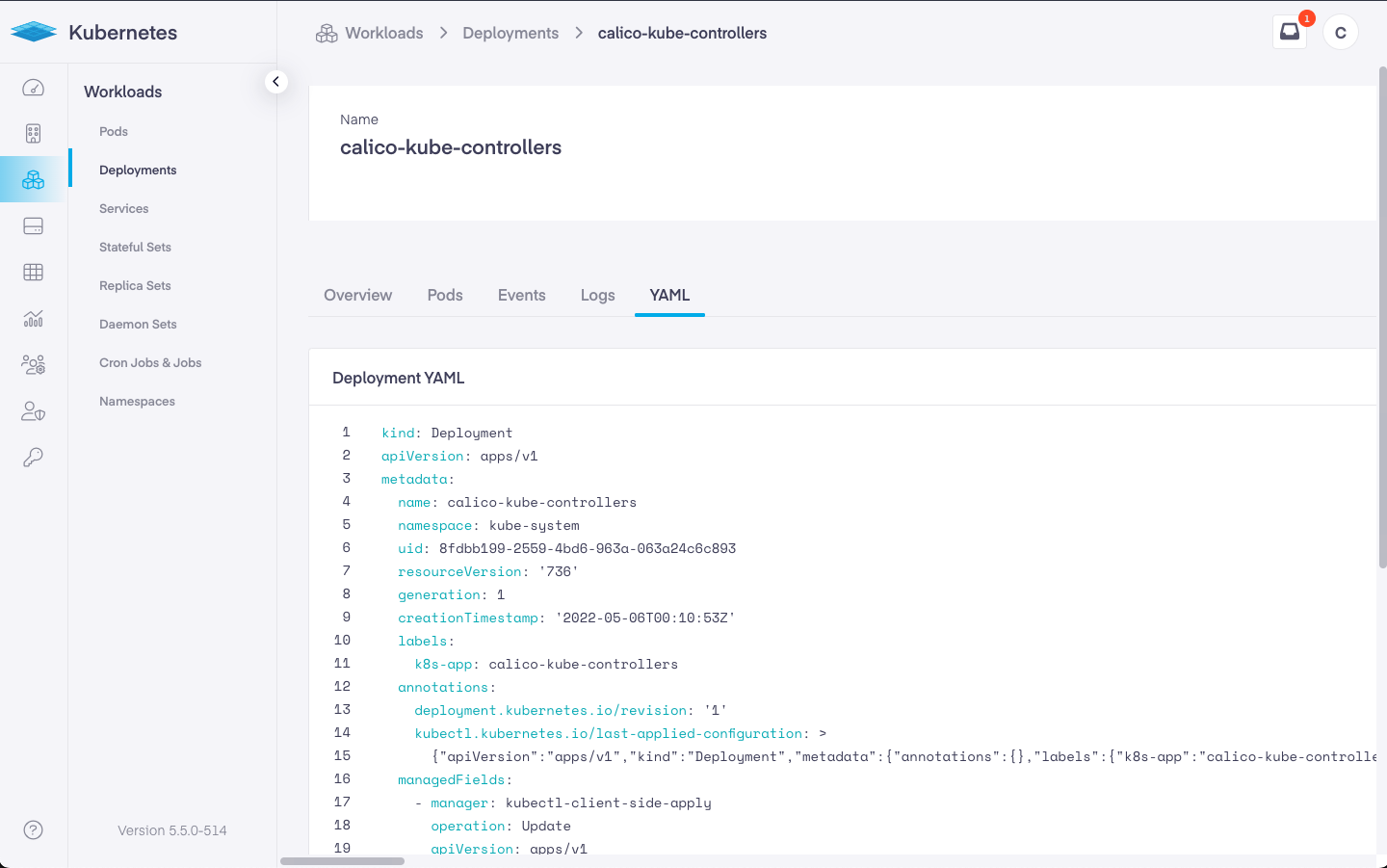 Clicking on the deployment link opens a new page showing tab options for the Overview, Events, Logs, and YAML pages for the deployment.