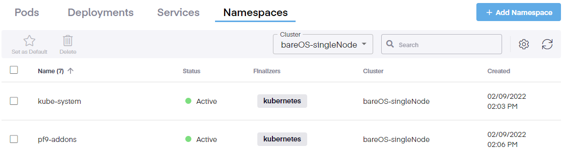 Selecting a checkbox next to a namespace allows users to set it as the default namespace or remove it.