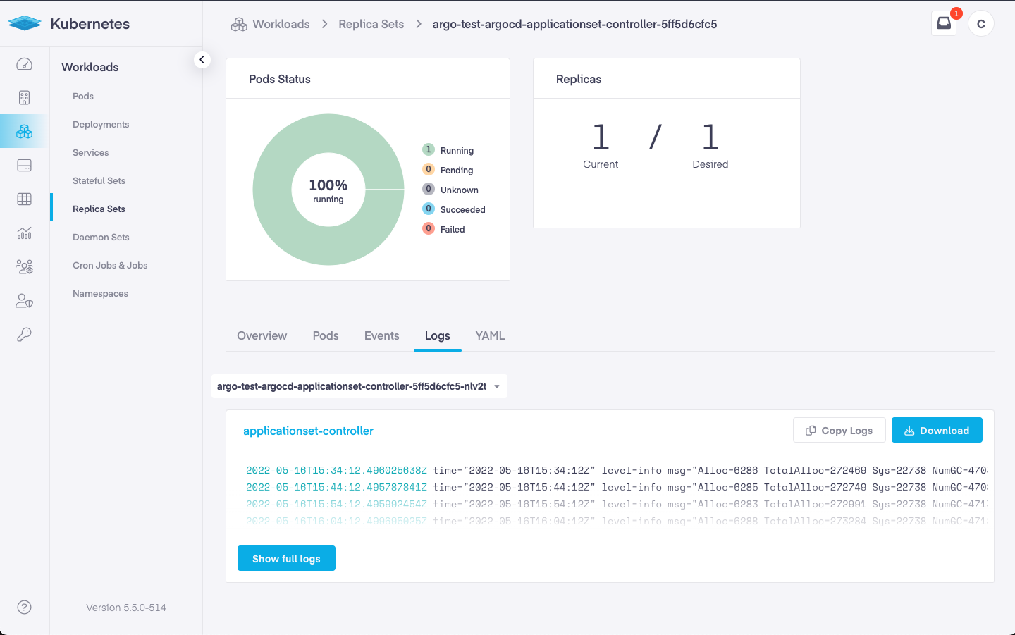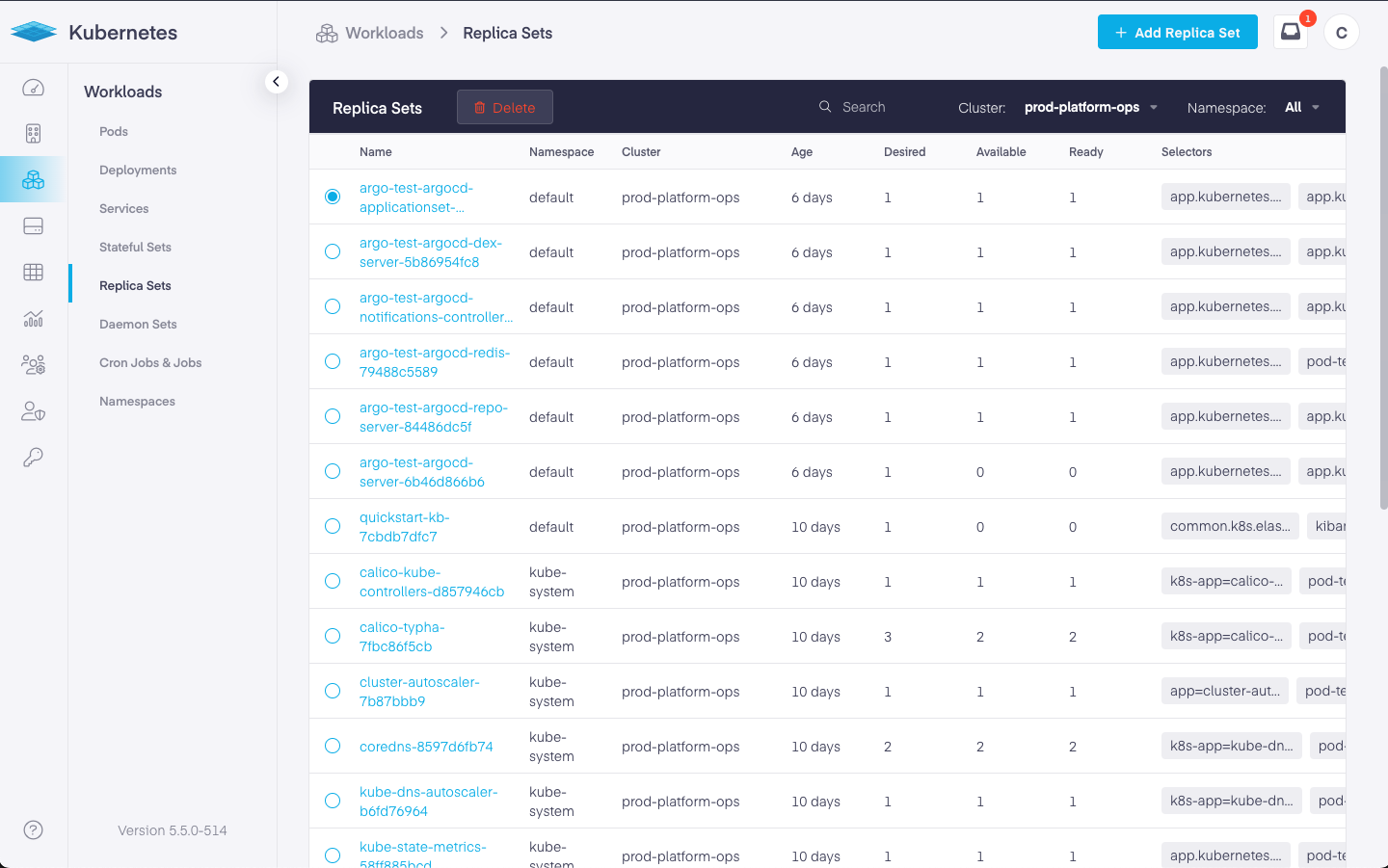 View and interact with ReplicaSets in realtime. Navigate to Workloads -> ReplicaSets and drill into a ReplicaSet by clicking on the ReplicaSet name.