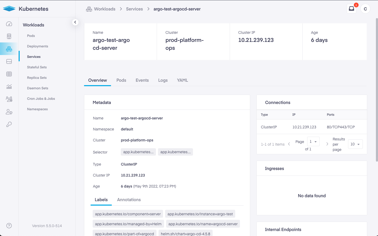 Further down we see the labels, annotations, connection details, internal endpoints, external endpoints, and ingresses.