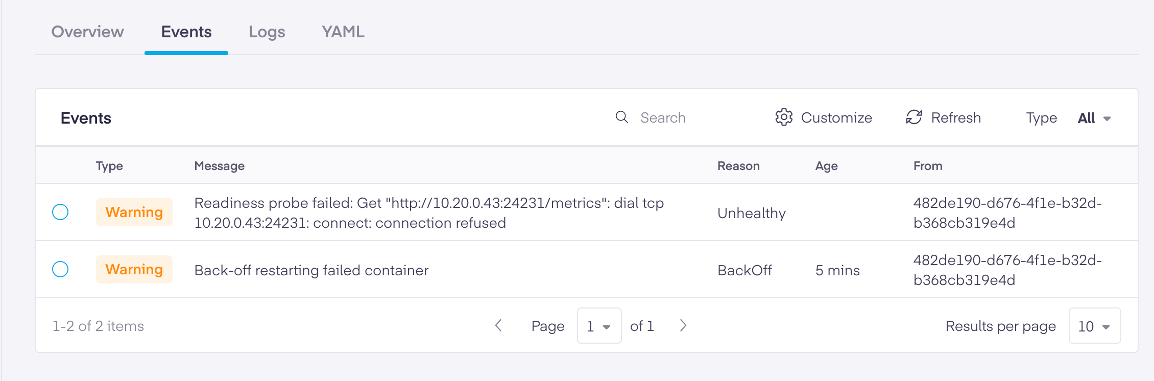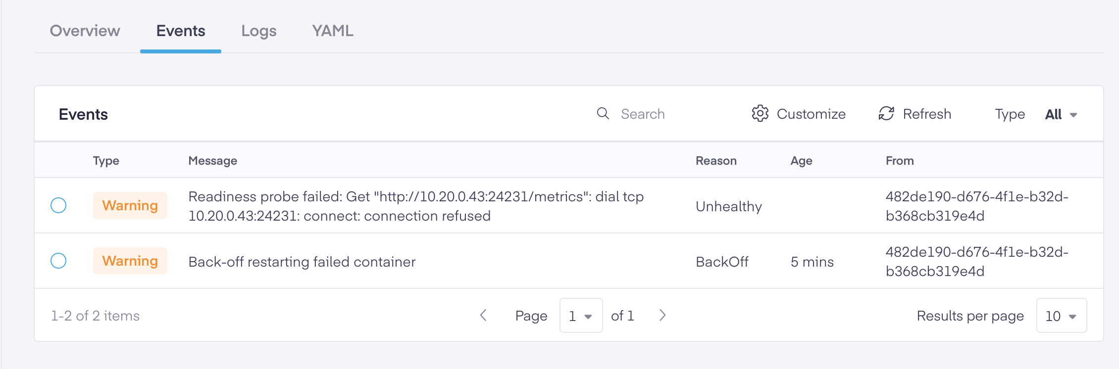 Any service related events and messages appear on the Events tab. Here you can choose the event type (warning, error, or normal), search for an event, click the circular icon to refresh the page, or click the gear icon to choose the columns seen.