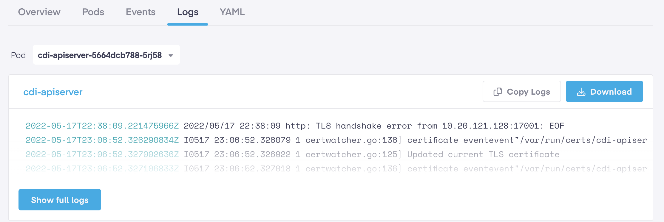 The logs tab provides easy access to logs for all pods that are part of this service. You can us the 'Pod' dropdown menu to select a specific pod to view its logs. The default view shows you a quick snippet into the latest log messages for that pod. Clicking on '*Show\_\_Full Logs'* button opens a new page to review the full logs for that pod. You can also easily copy the pod log messages or download the full log file from here.