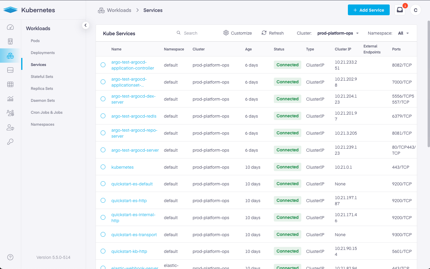 On this page, you can create a new service by clicking on the 'Add Service' button. Or you can view all existing services using the grid view. In the grid view, you can select the Kubernetes cluster and namespace that you want to view services for. You can search for a running service by using the search bar at the top of the grid, and specifying a text phrase that will appear in the service name or any of the service properties.