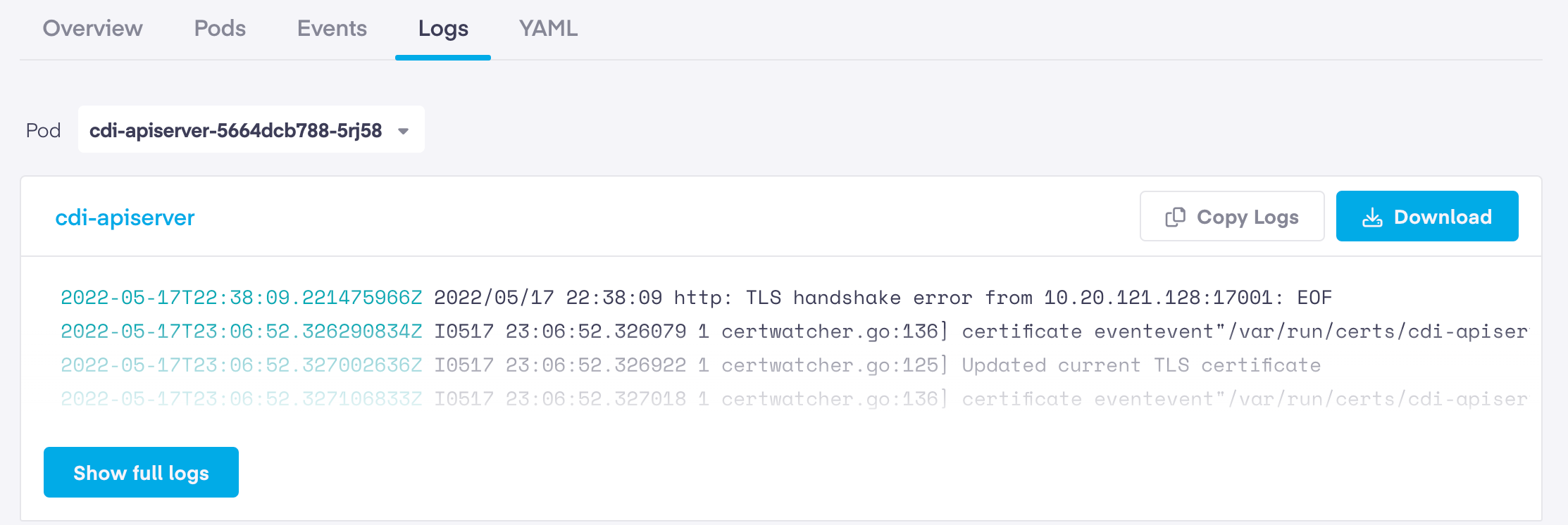 The logs tab provides easy access to logs for all pods that are part of this service. You can us the 'Pod' dropdown menu to select a specific pod to view its logs. The default view shows you a quick snippet into the latest log messages for that pod. Clicking on 'Show__Full Logs' button opens a new page to review the full logs for that pod. You can also easily copy the pod log messages or download the full log file from here.